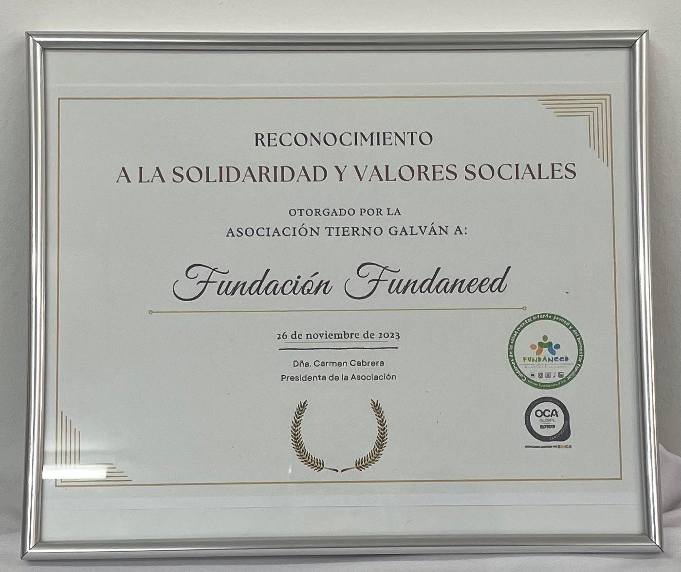 Premio a la Solidaridad y Valores Sociales, otorgado por la Asociación Tierno Galván el 20 de noviembre de 2023, que destacó el compromiso de Fundaneed con la inclusión y la mejora de la calidad de vida de las personas con discapacidad y sus familias