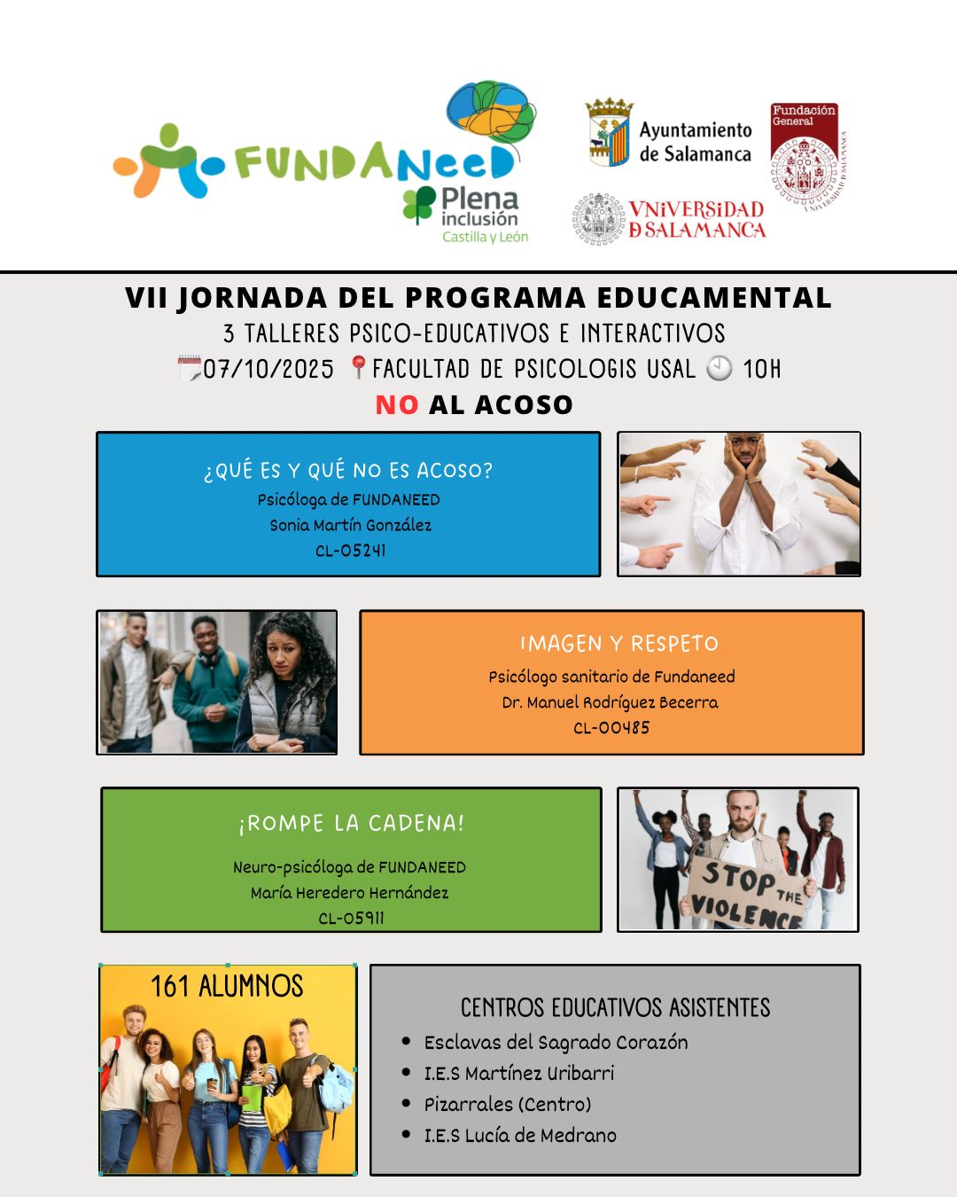 En FUNDANEED, como fundación dedicada a la inclusión y el bienestar emocional, estamos emocionados de anunciar la VII Jornada del Programa EducaMENTAL, un espacio vital para combatir el acoso y el ciberacoso escolar. El próximo 7 de octubre de 2025, en la Facultad de Psicología de la Universidad de Salamanca (USAL), daremos un paso más en nuestra misión con tres talleres psico-educativos e interactivos diseñados para empoderar a estudiantes, educadores y familias.